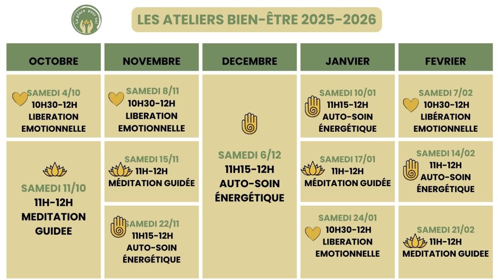 Tous au long de l’année, je te propose des ateliers collectifs afin de te permettre de mieux gérer ton bien-être au quotidien en toute autonomie. Ces ateliers sont également l’occasion de reprogrammer ton inconscient, harmoniser tes chakras, transformer certaines croyances limitantes. Ils sont aussi et surtout un moment de partage et de convivialité.